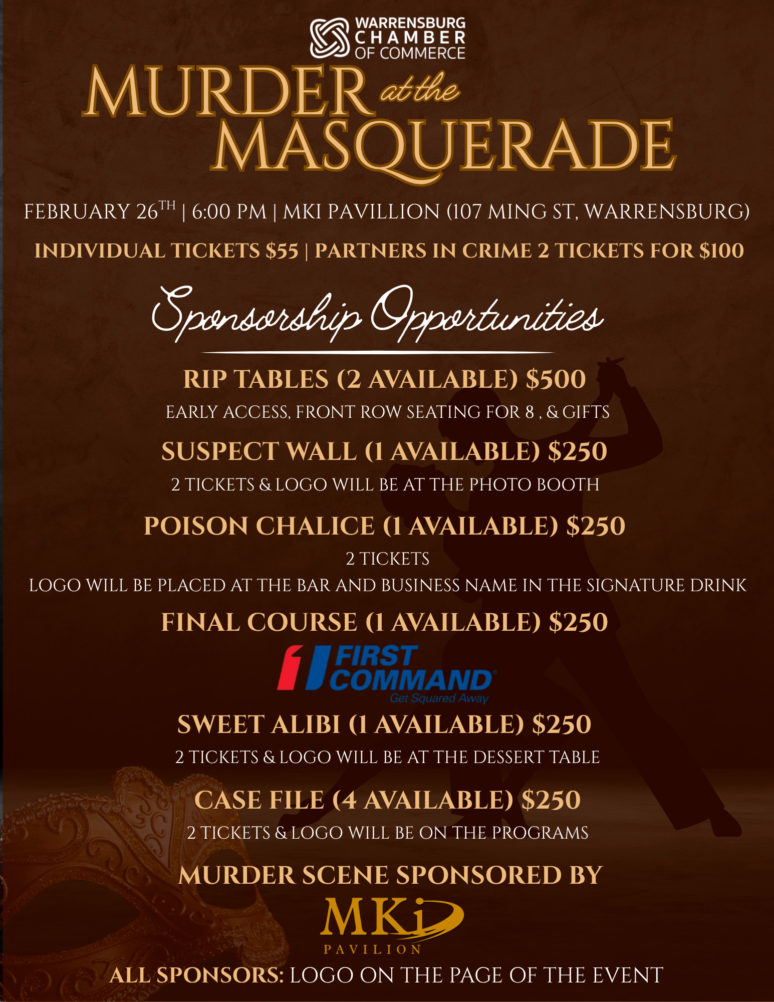 Murder at the Masquerade Sponsorship Please submit your application by February 12, 2026. "*" indicates required fields Δ Sponsor Name* First Last Email* Phone*Business/OrganizationEvent Sponsor*Sponsorship Level*Note: Sponsorships do not include tickets. All sponsor logos will appear on the event page. Poison Chalice (2 Tickets & Logo will be placed at the bar and business name in the signature drink) Sweet Alibi (2 Tickets & Logo will be at the dessert table) Case File (2 Tickets & Logo will be on the programs) RIP Tables (8 Tickets, Early access, Front row seating, & Gifts) Sponsorship Subtotal $0.00 Additional Attendee Name* First Last This field is hidden when viewing the formRIP TablesAdditional RIP Attendees*First NameLast Name Add RemoveTotal Payment Method*Select OneCreditCheckCashProcessing Fee $0.00 Credit Card*Card Details Cardholder Name Previous Next