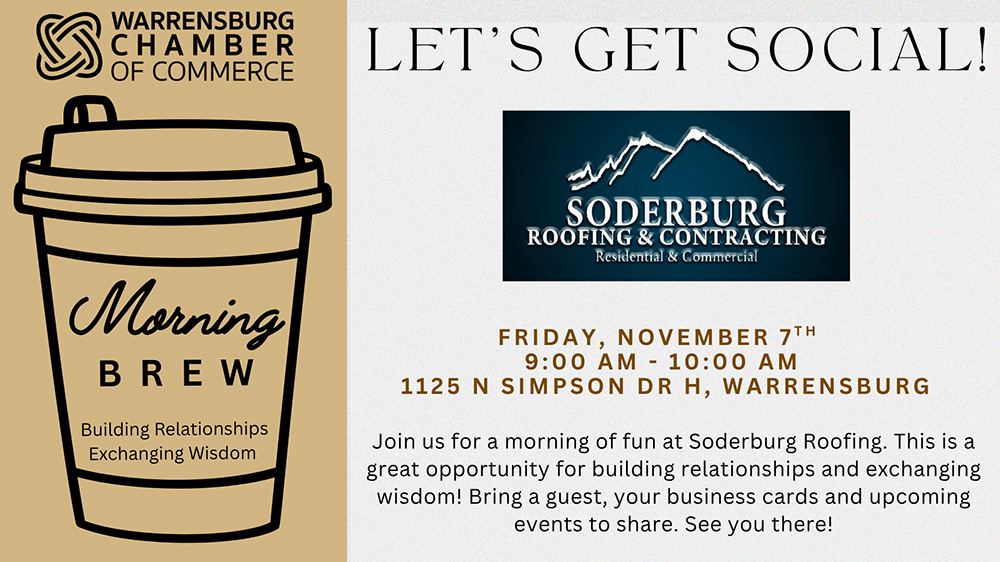 Join us on Friday, November 7th from 9:00 AM to 10:00 AM at Soderburg Roofing (1125 N Simpson Dr H) for a morning of networking, connection, and community! Morning Brew...